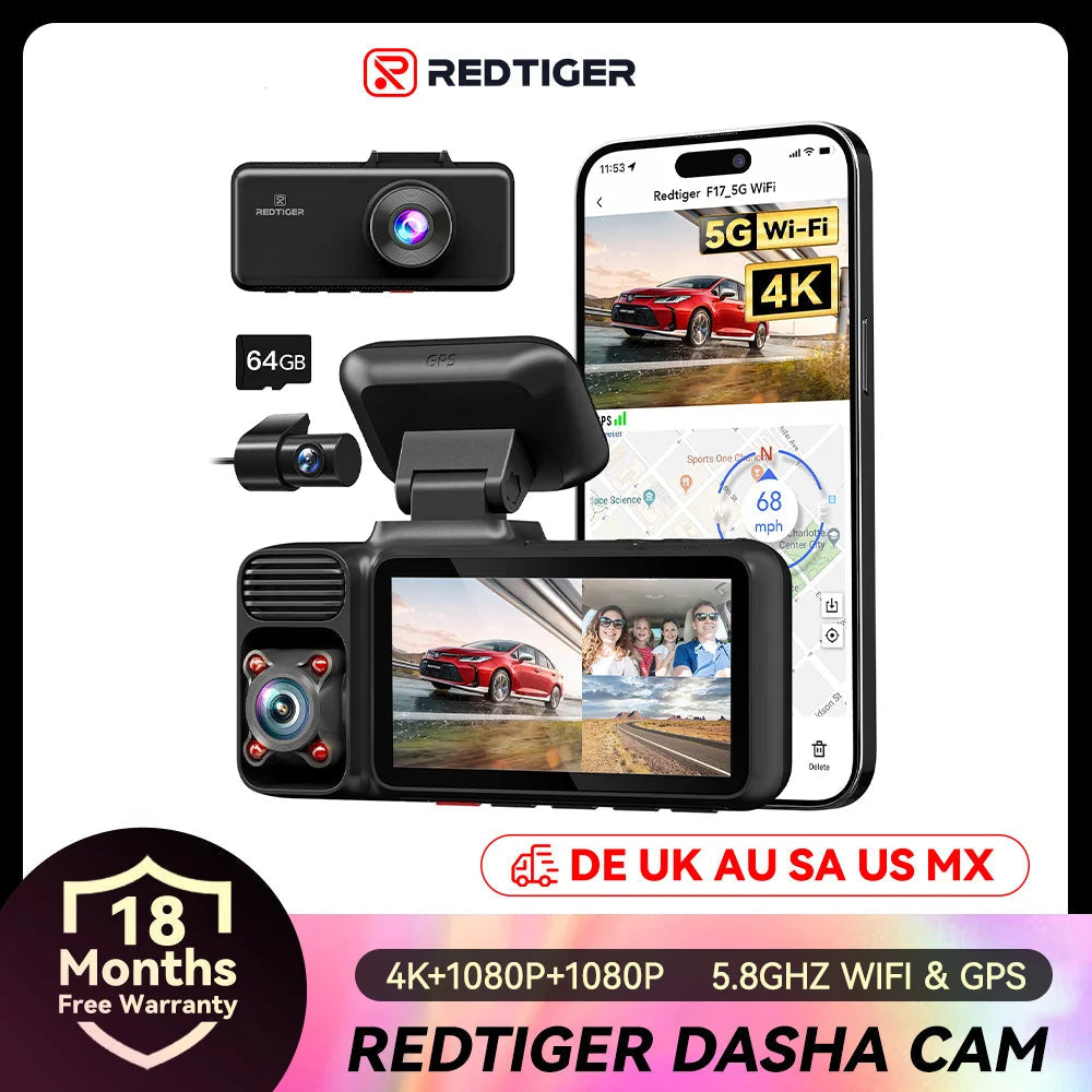 Redtiger F17 4k 3 Car Cameras 5.8Ghz Wifi Dash Camera For IR Night Vision Car Dvr For Wifi Dash Cameras Built-In Gps WDR
