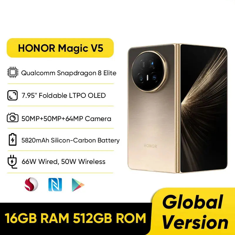 Honor Magic V5 Global Version 5G Foldable Smartphone Snapdragon 8 Elite 7.95" LTPO OLED Display 5820mAh Battery 66W Super Charge
