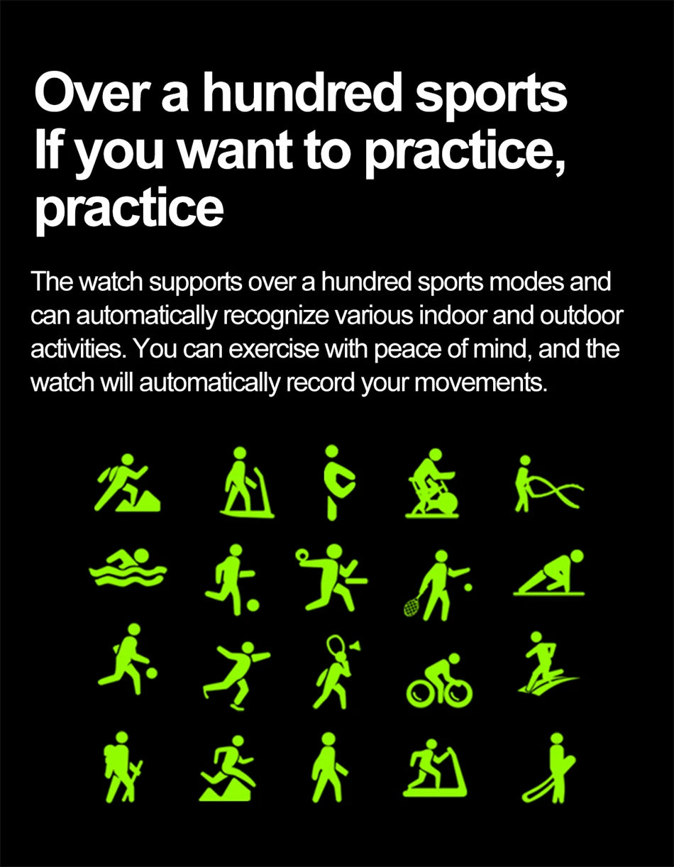 Watch features 8: Multiple sports modes: The sports mode cooperates with professional sensors to comprehensively record sports data and conduct scientific analysis to effectively improve your sports level.