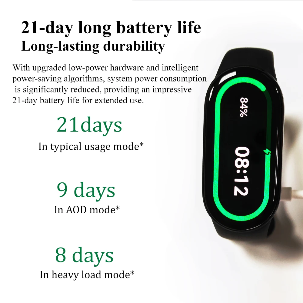 *AOD mode test conditions for Xiaomi Smart Band 10: With the battery fully charged using factory default settings with a static watch face and AOD display turned on, and with high-precision sleep monitoring, in-sleep breathing monitoring, and all-day stress and blood oxygen monitoring turned off; whole-day heart rate monitoring turned on at a frequency of once every 30 minutes; message reminders (100 messages, 10 call reminders, 3 alarms per day) turned on; screen arm-movement activated 200 times per day; blood oxygen saturation manually measured twice per day and movement recording turned on for 60 minutes per week.