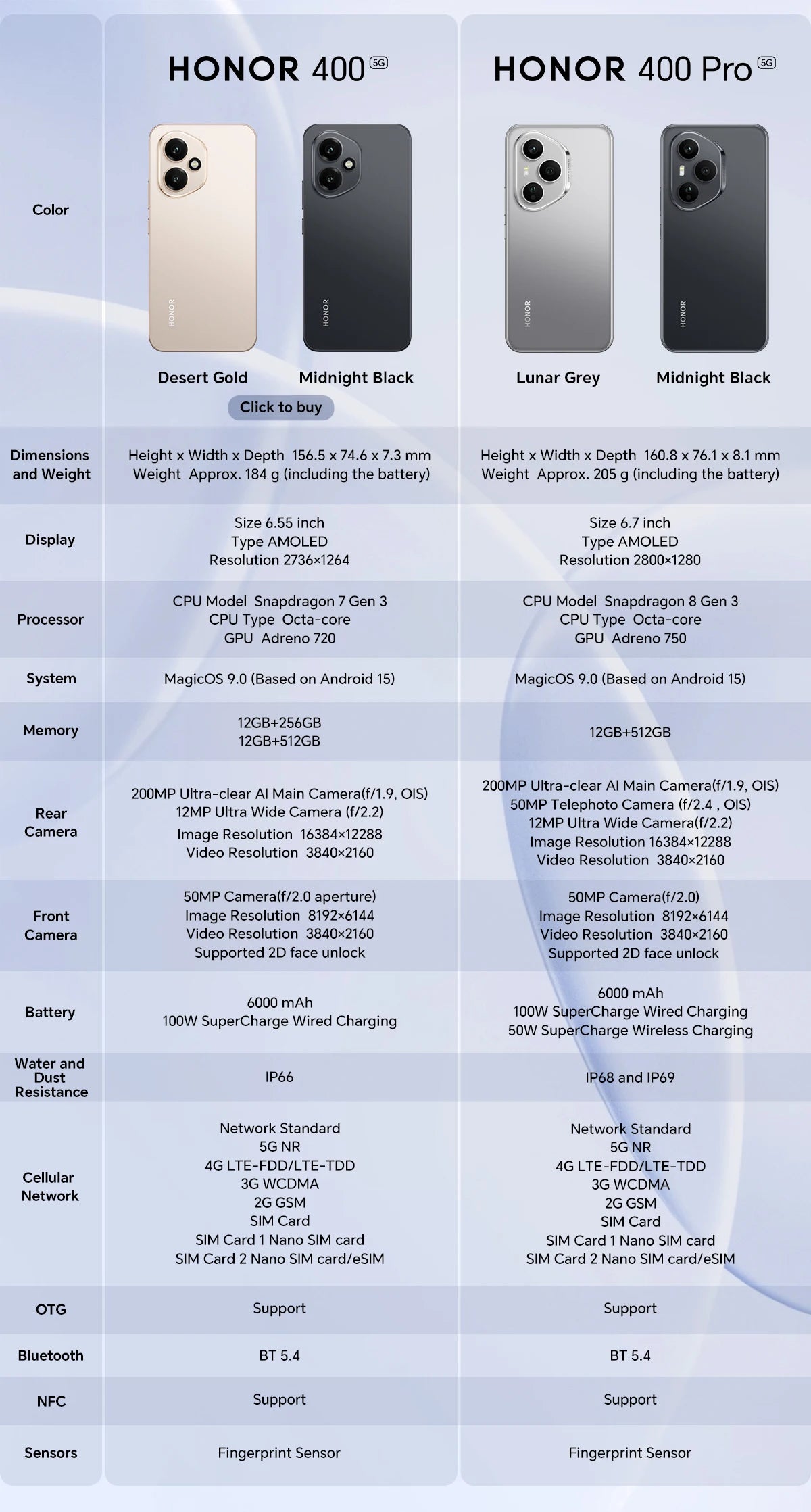 Honor 400 Pro 5G Global Version Smartphone 200MP AI Main Camera 6.7'' AMOLED Screen 6000 mAh 100W Wired 50W Wireless