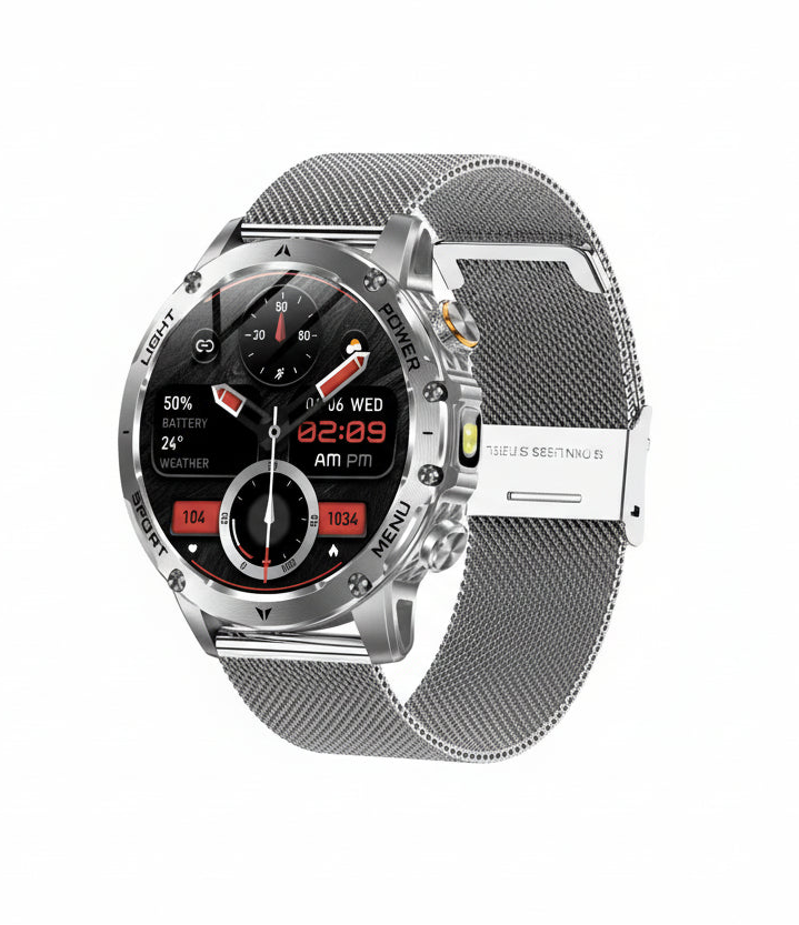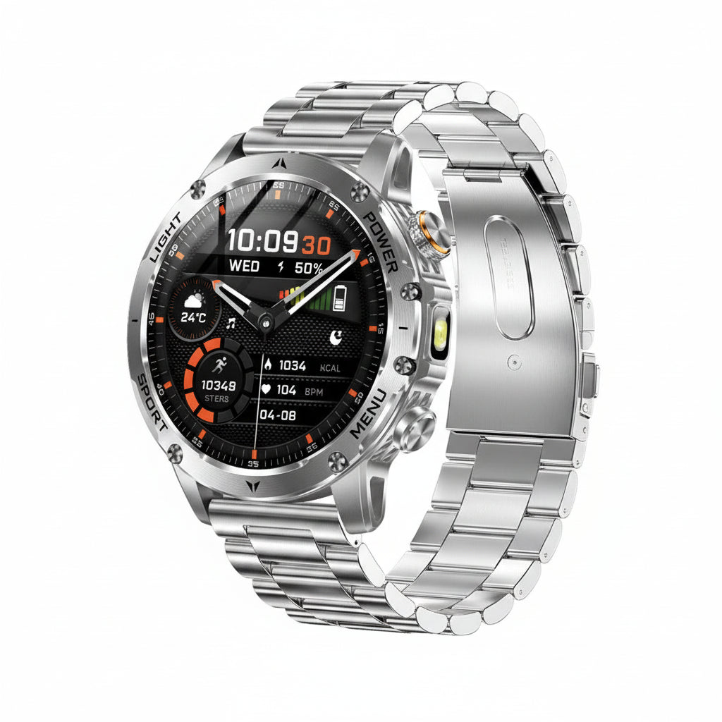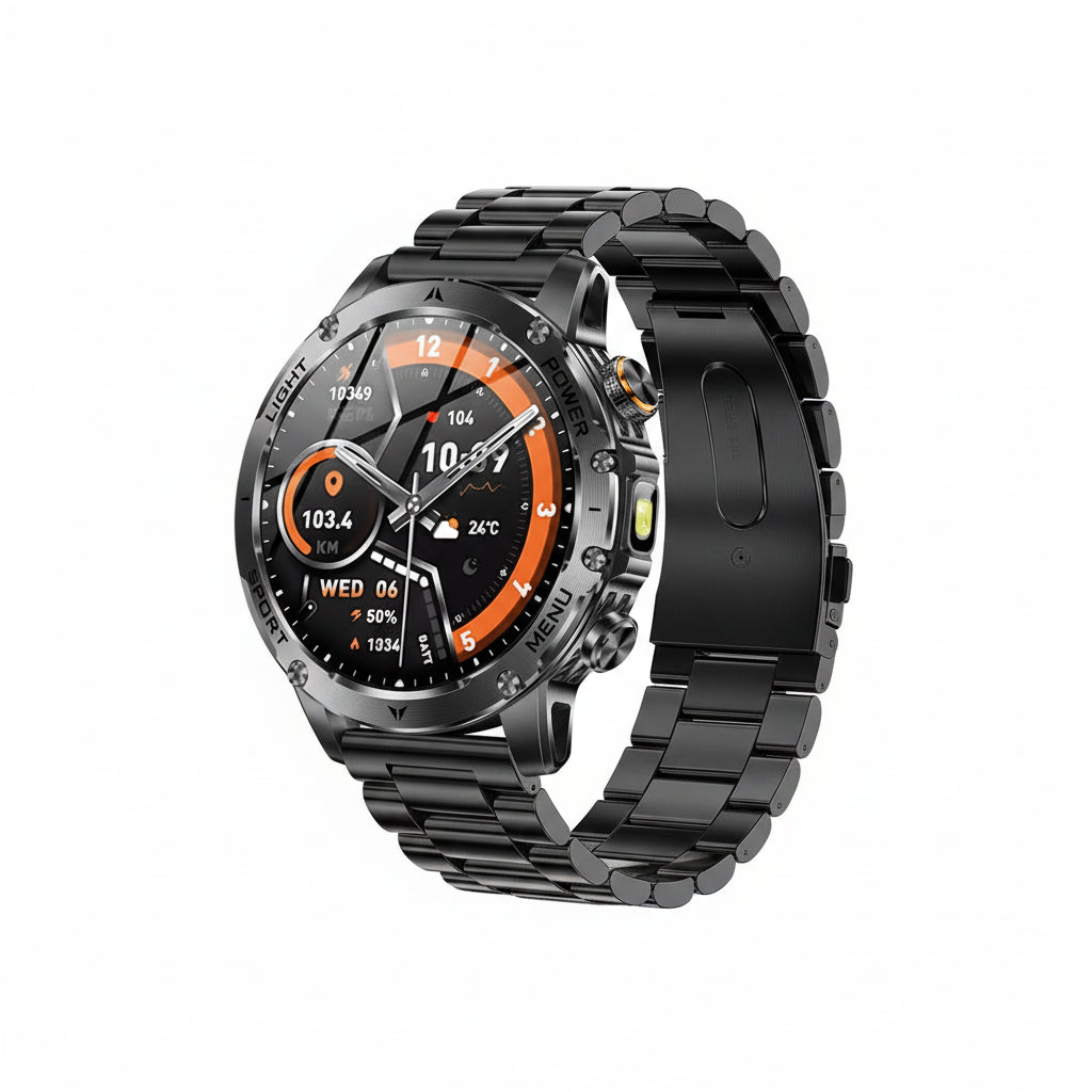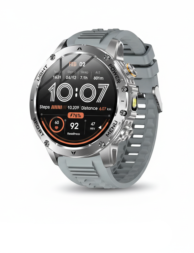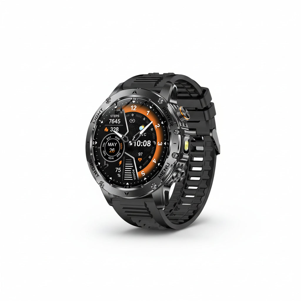 With IP69K / 5ATM waterproof protection, built-in LED flashlight, and Bluetooth calling, this smartwatch is ideal for sports, outdoor adventures, and daily wear.