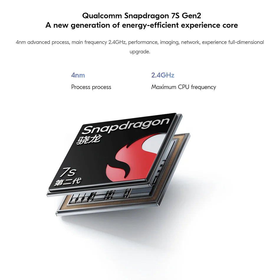 CPU --------------- Qualcomm Snapdragon 7S Gen 2 Octa Core CPU, up to 2.4GHz, Adreno 710 GPU