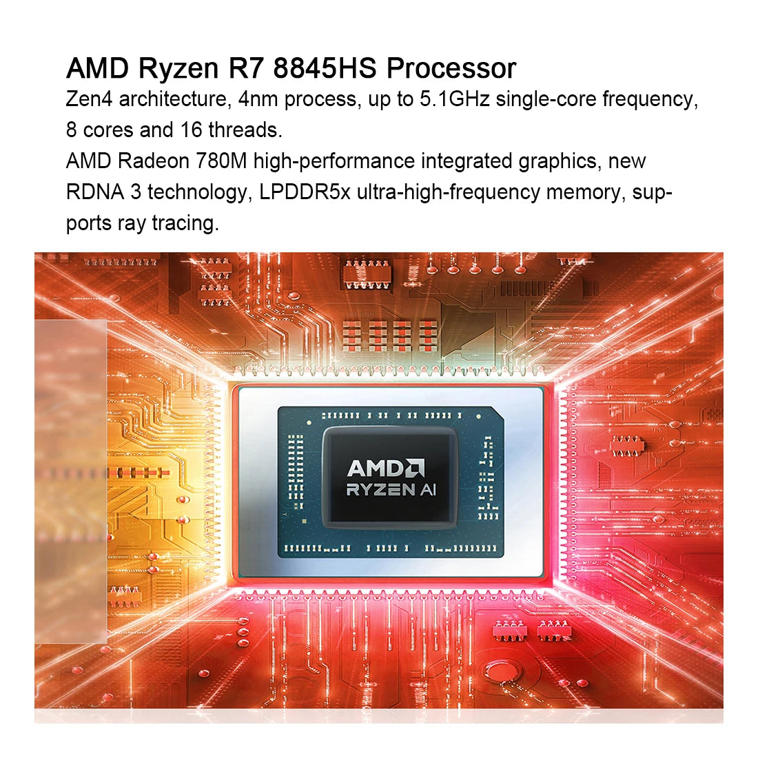 2. Ryzen R7 8845HS standard voltage processor, Zen4 architecture, 8 cores and 16 threads. Built-in AMD Ryzen AI engine, AMD Radeon 780M integrated graphics, easily handles creation and gaming.