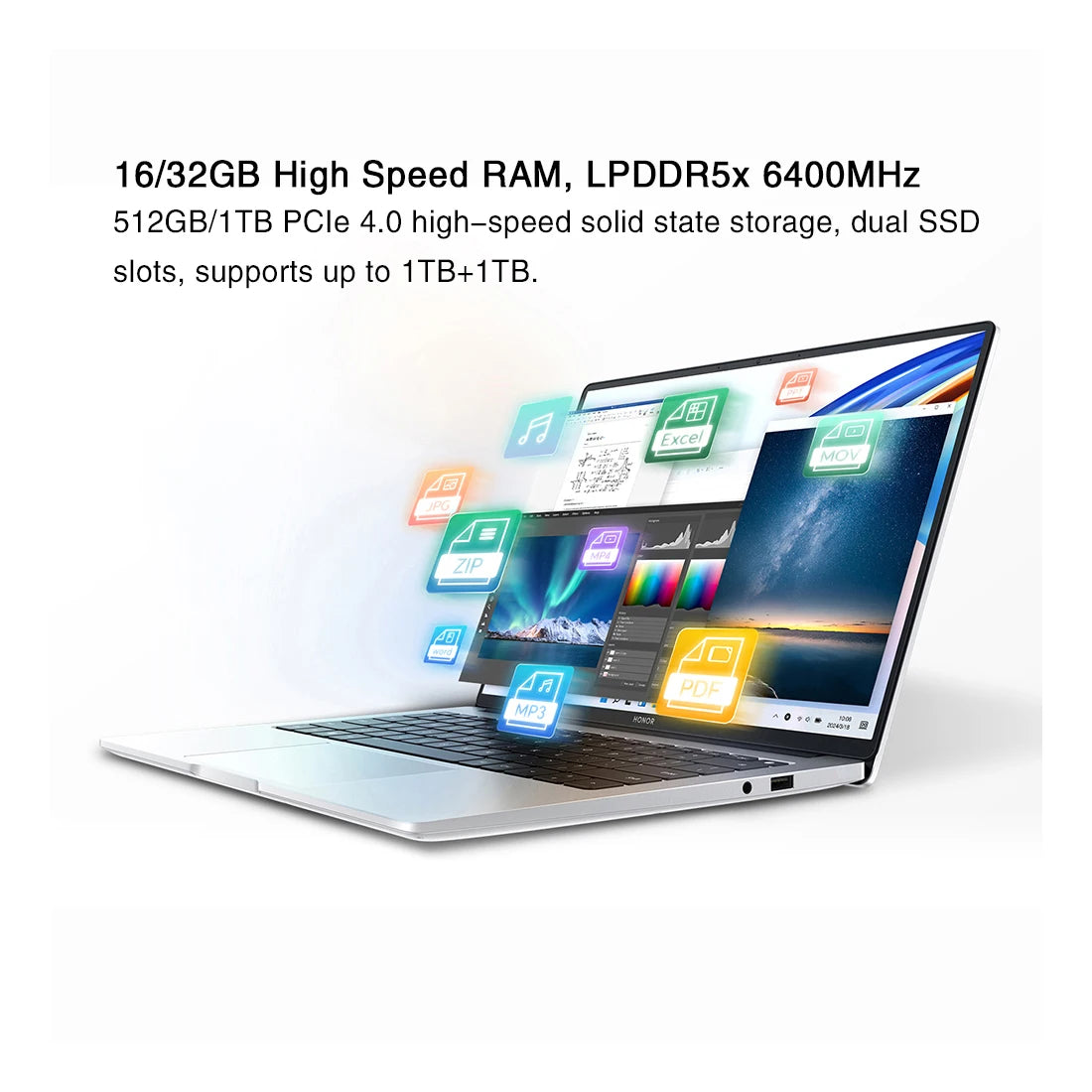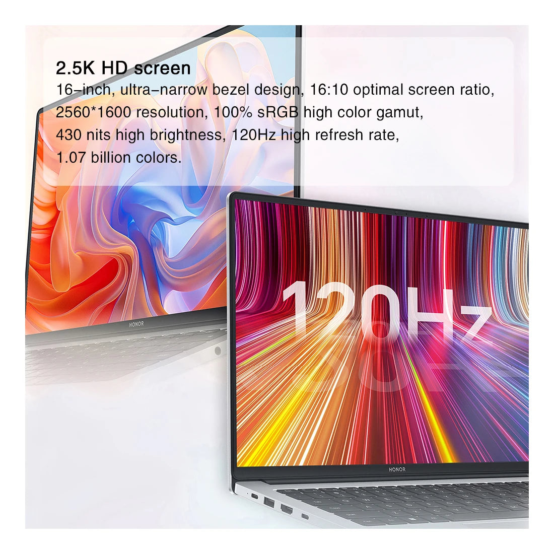 1. 16-inch eye-care screen, 2.5K resolution (2560*1600), 120Hz high refresh rate, multiple technologies to protect eye health, HONOR's self-developed natural light simulation technology, certified by TÜV Rheinland for dual eye protection.