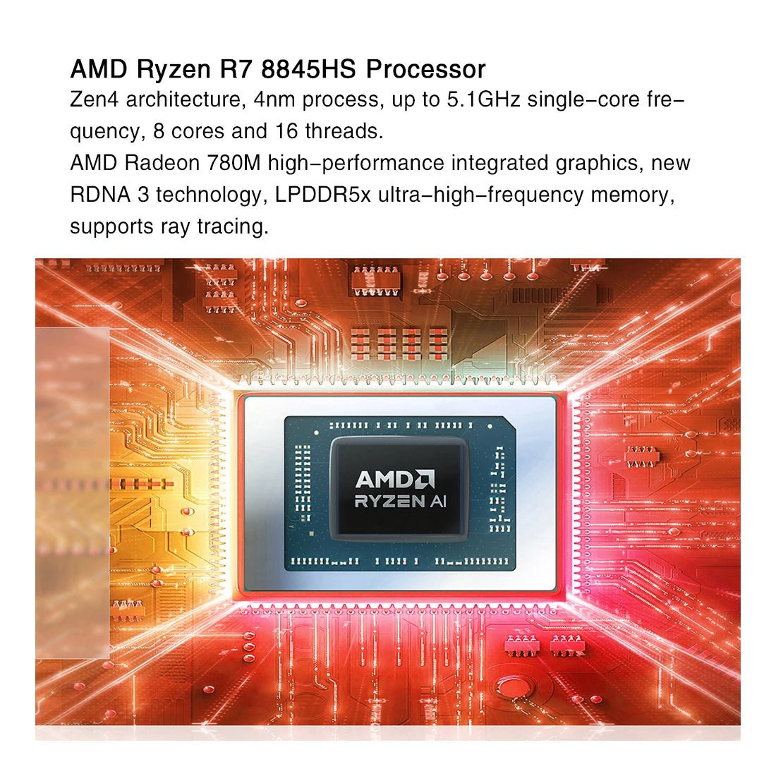 3. Ryzen R7 8845HS standard voltage processor, Zen4 architecture, 8 cores and 16 threads, max boost clock up to 5.1GHz. Built-in AMD Ryzen AI engine, AMD Radeon 780M integrated graphics, effortlessly handles creation and gaming.