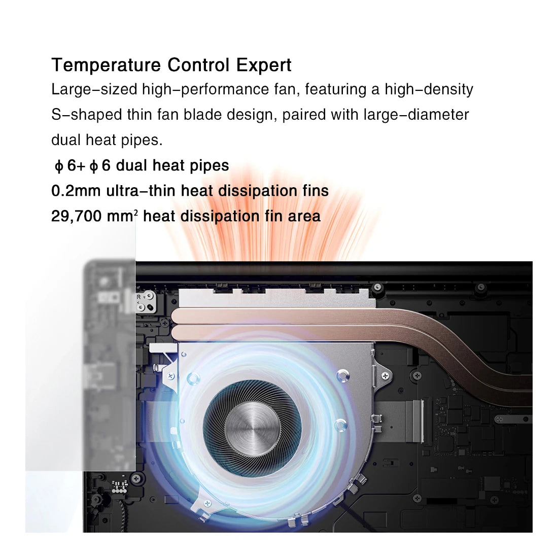 Large-sized high-performance fan, featuring a high-density S-shaped thin fan blade design, paired with large-diameter dual heat pipes, significantly enhancing the overall heat dissipation capability and efficiency of the machine.