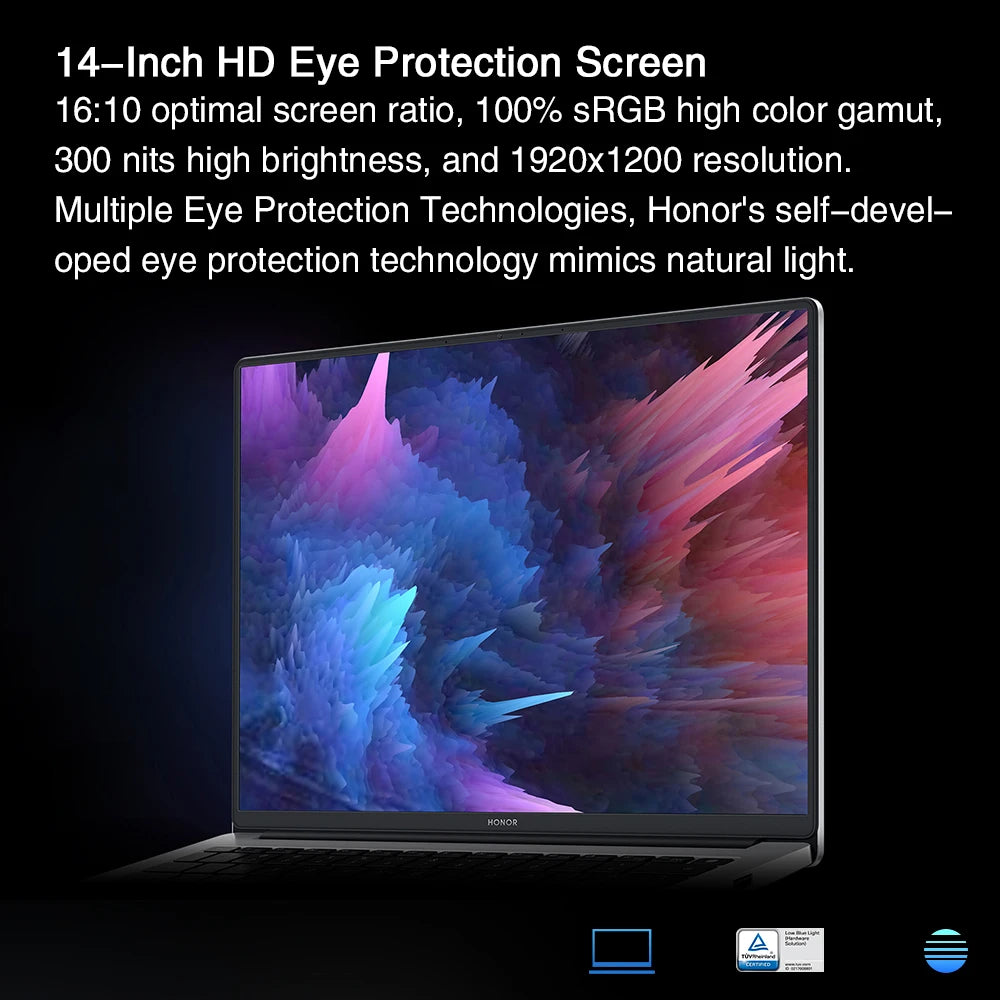Vivid and rich colors with an ultra-narrow bezel design, 16:10 optimal screen ratio, 100% sRGB high color gamut, 300 nits high brightness, and 1920x1200 resolution.