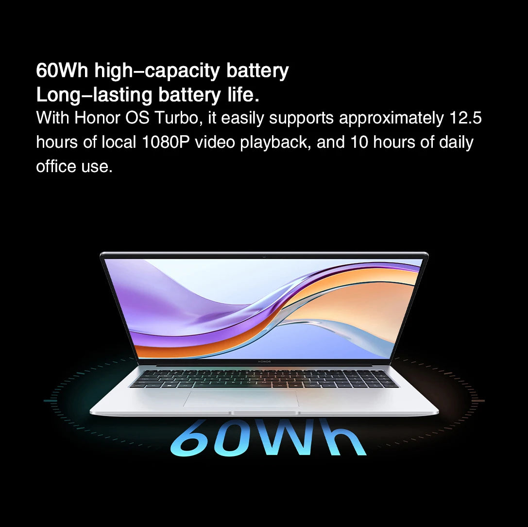 With Honor OS Turbo, it easily supports approximately 12.5 hours of local 1080P video playback, and 10 hours of daily office use.