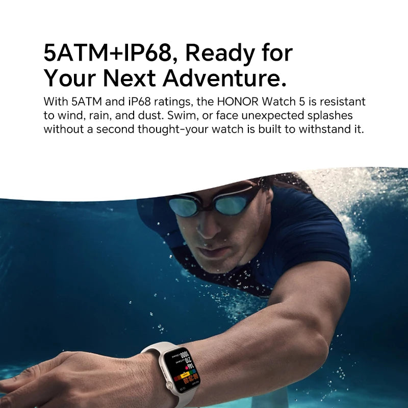 (According to ISO standard 22810:2010, the water resistance rating is 5ATM (50 m). It is suitable for shallow-water activities such as swimming in swimming pools and at the beach, but not suitable for underwater diving, diving, hot water showers, saunas, hot springs, and other water activities with high-speed water flow or in deep water.)
