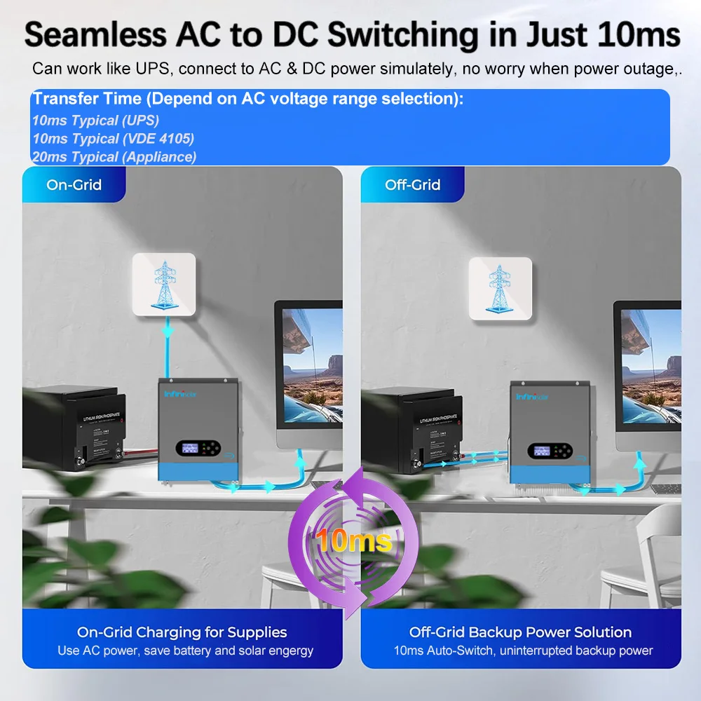 It can work like UPS. 10ms/20ms AC & DC auto-switching ensures uninterrupted power for critical loads during grid transitions.