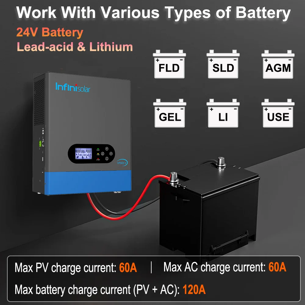 The inverter features wide battery compatibility, allowing connection to 24V Lead-acid (AGM, GEL, FLA, SLA...) batteries, Lithium (LiFePO4) batteries and user-defined batteries.