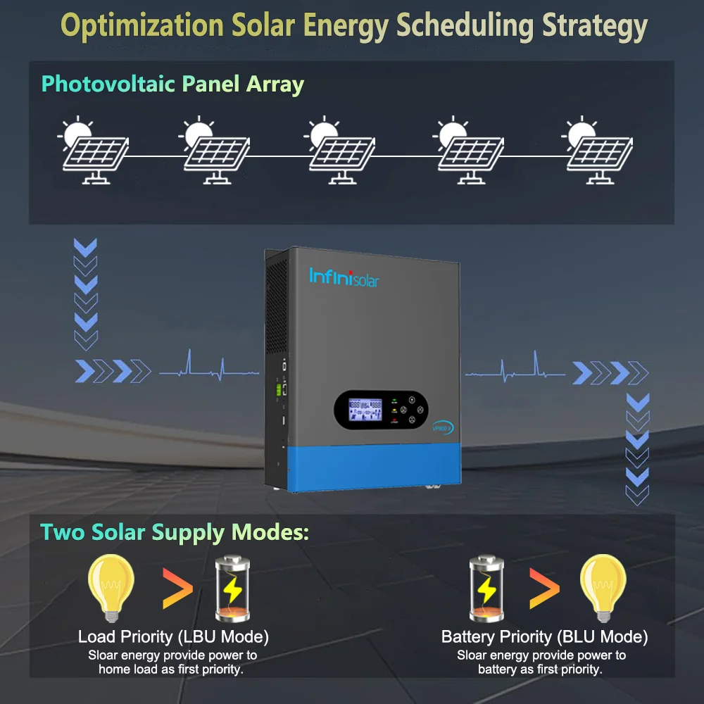 Featuring two solar supply modes: load priority and battery priority. Load priority mode can directly use solar energy to power home appliances for optimal self-consumption. Battery priority mode will charge the battery first for reliable backup energy. Let you align solar flow with your specific energy requirement.