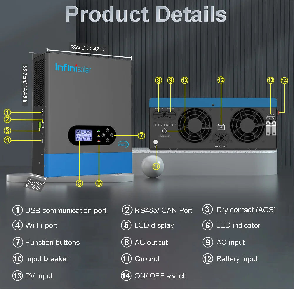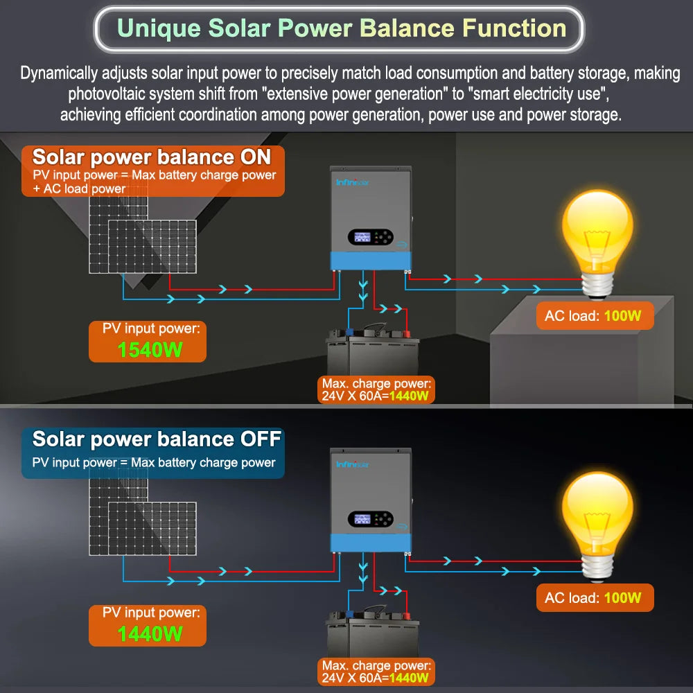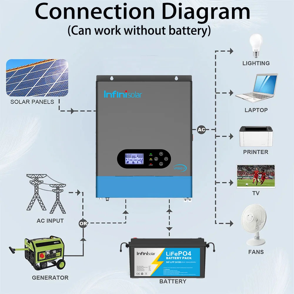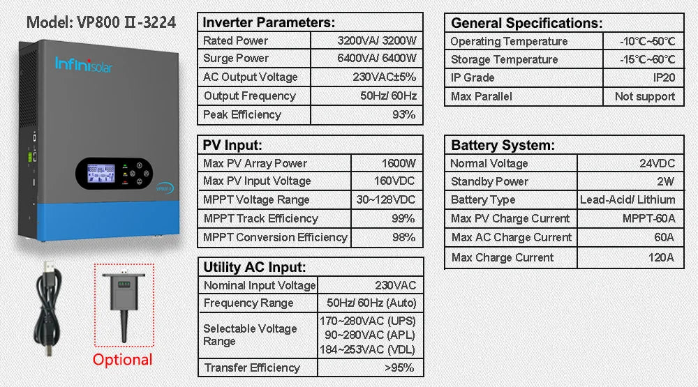 Infinisolar VP800 Ⅱ-3224 inverter is a 3.2KW 24V to 220V/230V/240V single-phase off-grid all-in-one solar Inverter, with built-in 60A MPPT charger and 60A AC charger. Combining solar, AC utility/ generator, and battery to offer an uninterruptible power supply.