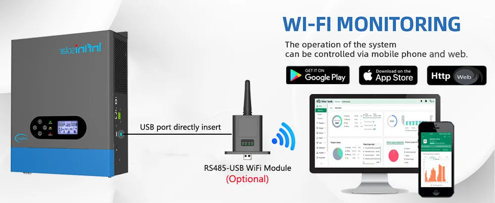 Unlike other inverters on the market, we use the USB-A interface that integrates an RS-485 communication function. This unique configuration enables seamless connection to an external Wi-Fi module, providing independent remote monitoring capabilities. Users can effortlessly access real-time device status or adjust parameters anytime & anywhere through a mobile app or PC web. (Note: The WiFi module is optional.)