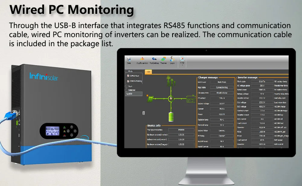 Through the USB-B interface that integrates RS-485 functions and a communication cable, wired PC monitoring of inverters can be realised. The communication cable is included in the package list. (Note: PC monitoring and Wi-Fi monitoring cannot be enabled at the same time.)