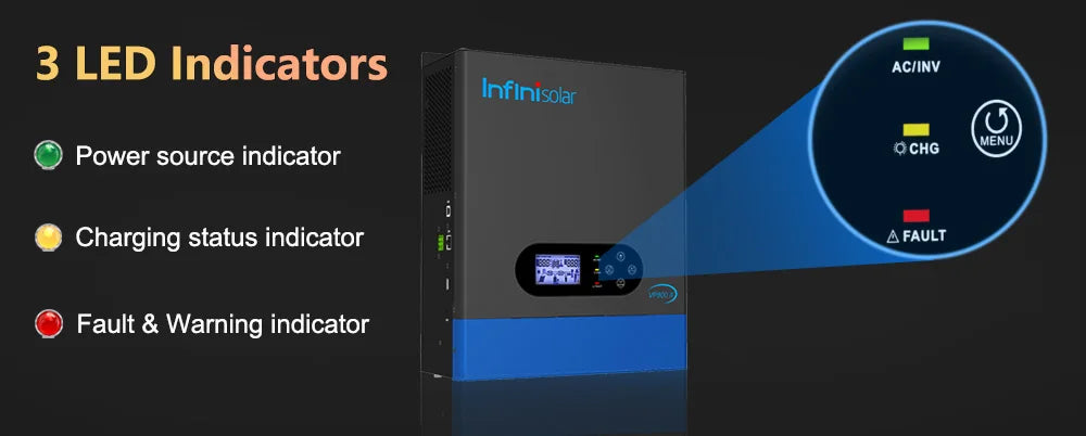 With function buttons and an LCD, indicating the operating status and input/output power information, allowing you to set parameters like battery charging current, working modes, etc.