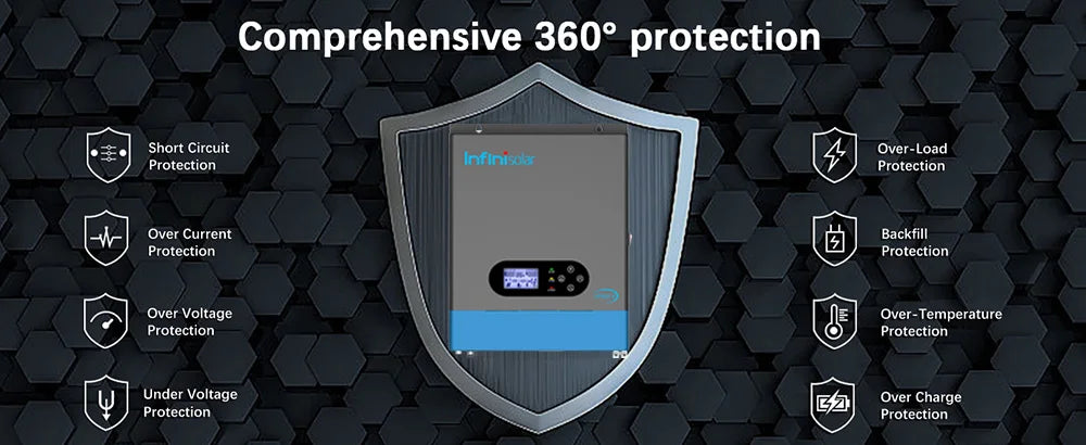 The hybrid solar inverter offers 360° comprehensive protection with various features, such as short circuit protection, over-voltage and under-voltage protection, overload protection, and reverse polarity protection. These safety measures significantly enhance the security of your electrical circuits and usage.