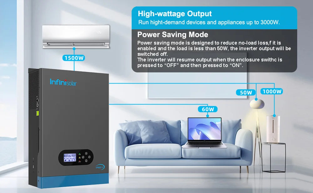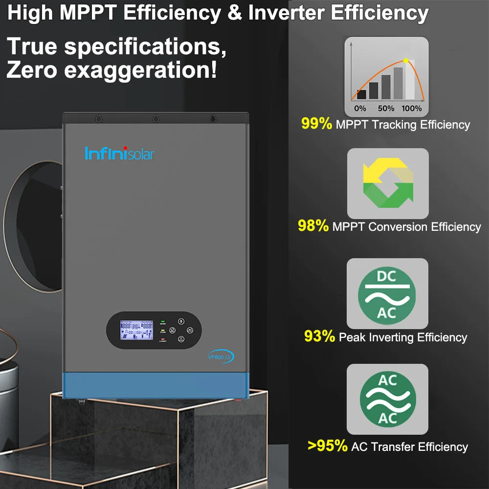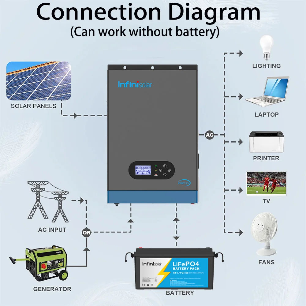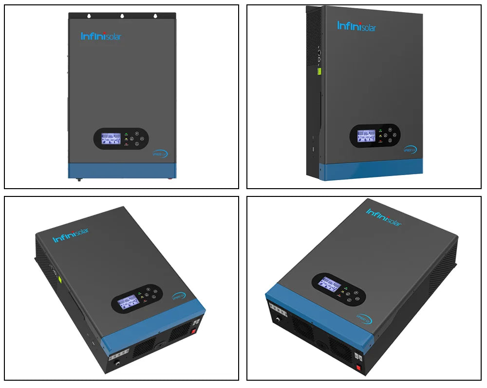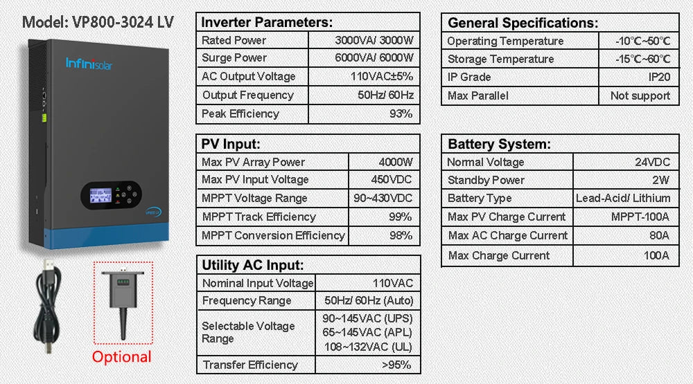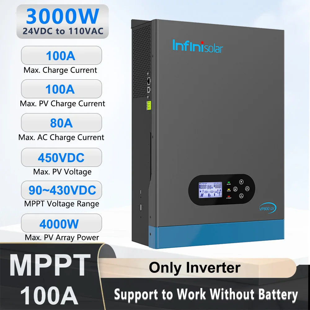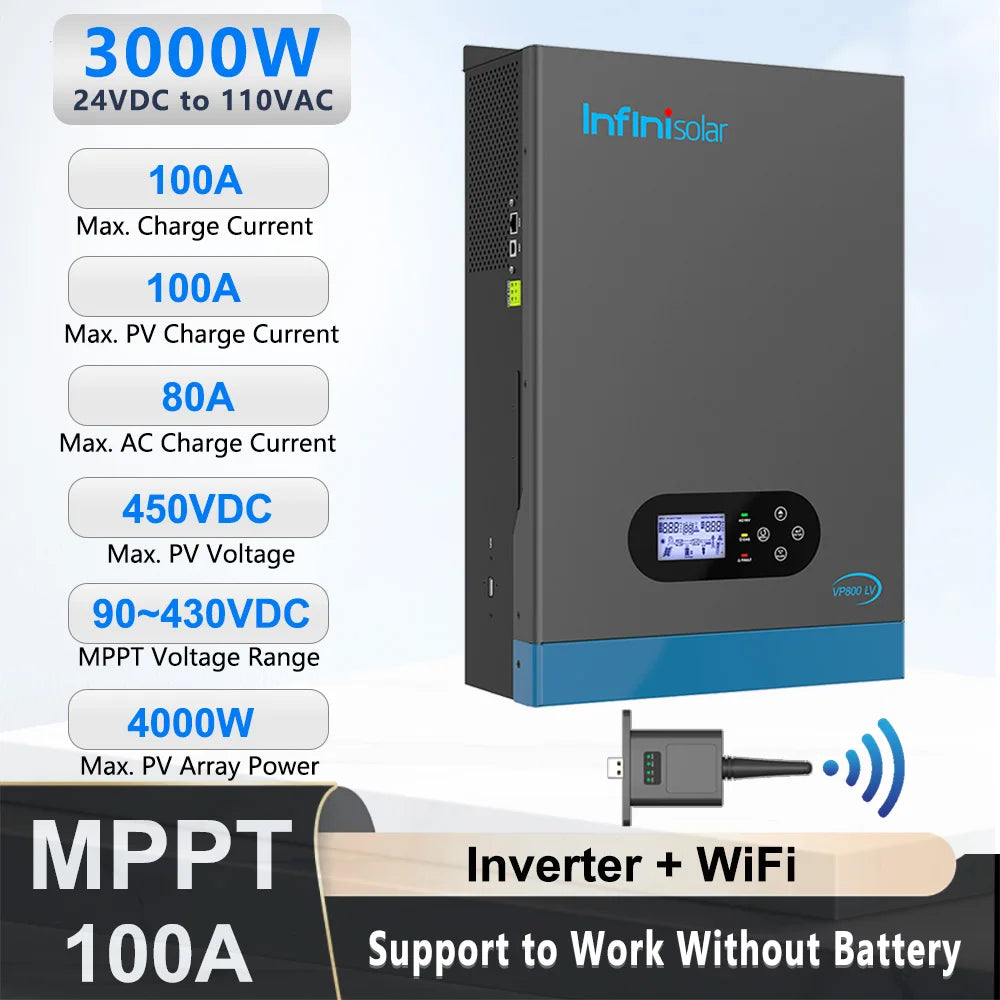 Infinisolar VP800-3024 LV inverter is a 3KW 24V to 100V/110V/120V single-phase off-grid all-in-one solar Inverter, with built-in 100A MPPT charger and 80A AC charger. Combining solar, AC utility/ generator, and battery to offer an uninterruptible power supply.