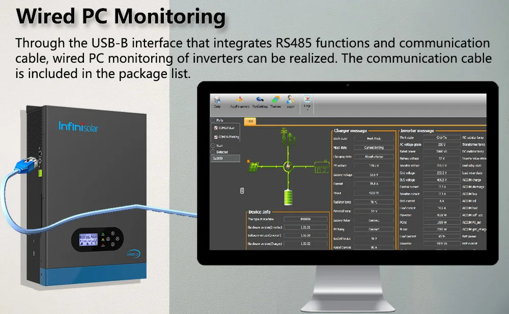 Through the USB-B interface that integrates RS-485 functions and a communication cable, wired PC monitoring of inverters can be realised. The communication cable is included in the package list. (Note: PC monitoring and Wi-Fi monitoring cannot be enabled at the same time.)
