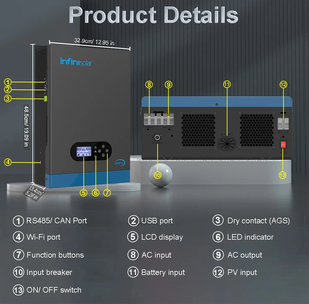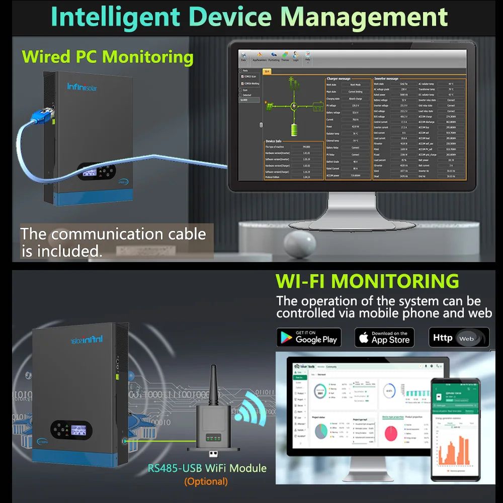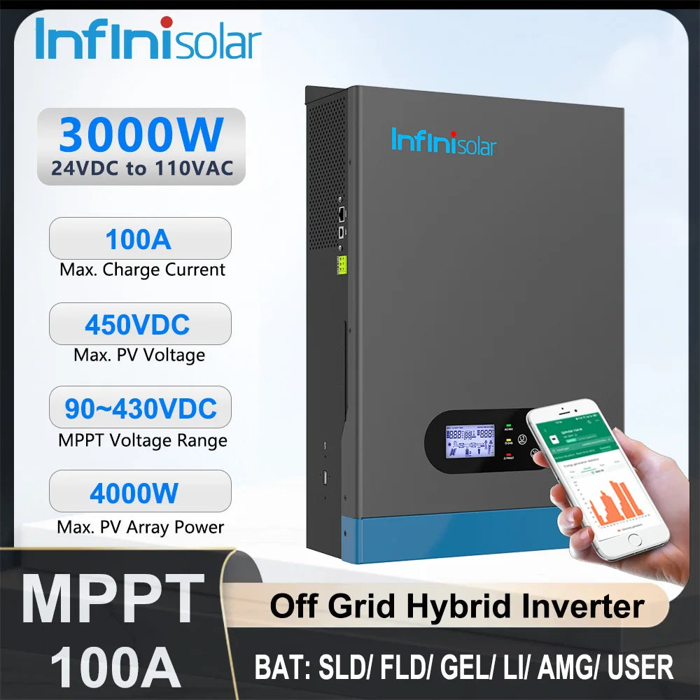 Infinisolar 3KW 24V to 110V Hybrid Solar Inverter Pure Sine Wave MPPT Off Grid Photovoltaic Inverters BMS PC WiFi Monitoring