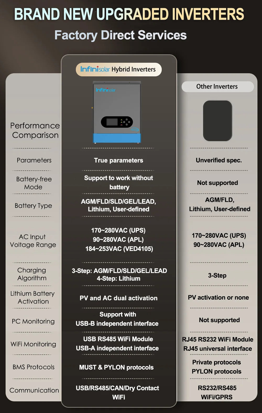 Compared to other inverters, we have adopted a 3-step charging algorithm for lead-acid battery, a 4-step charging algorithm for Lithium battery, which unlocks 30% longer battery life with precision parameter tuning.