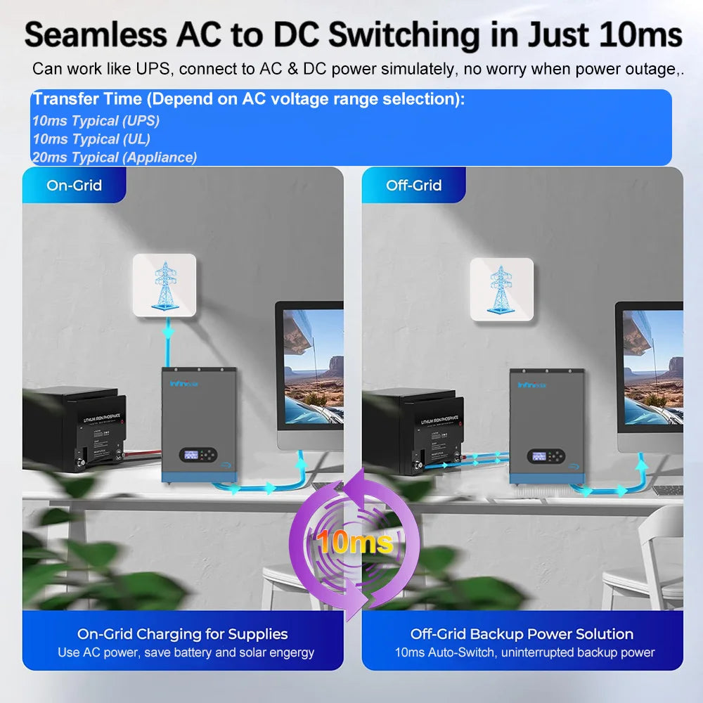Can work like UPS, 10ms/20ms AC & DC auto-switching ensures uninterrupted power for critical loads during grid transitions.