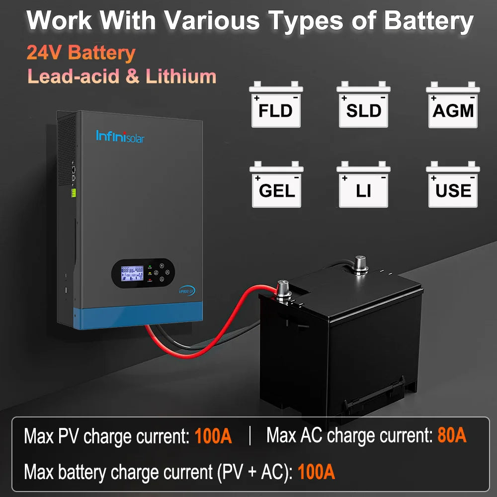 The inverter features wide battery compatibility, allowing connection to 24V Lead-acid (AGM, GEL, FLA, SLA...) batteries, Lithium (LiFePO4) batteries and user-defined batteries.
