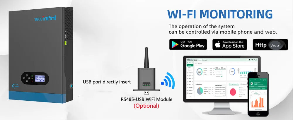 Unlike other inverters on the market, we use the USB-A interface that integrates an RS-485 communication function. This unique configuration enables seamless connection to an external Wi-Fi module, providing independent remote monitoring capabilities. Users can effortlessly access real-time device status or adjust parameters anytime & anywhere through a mobile app or PC web. (Note: The WiFi module is optional.)