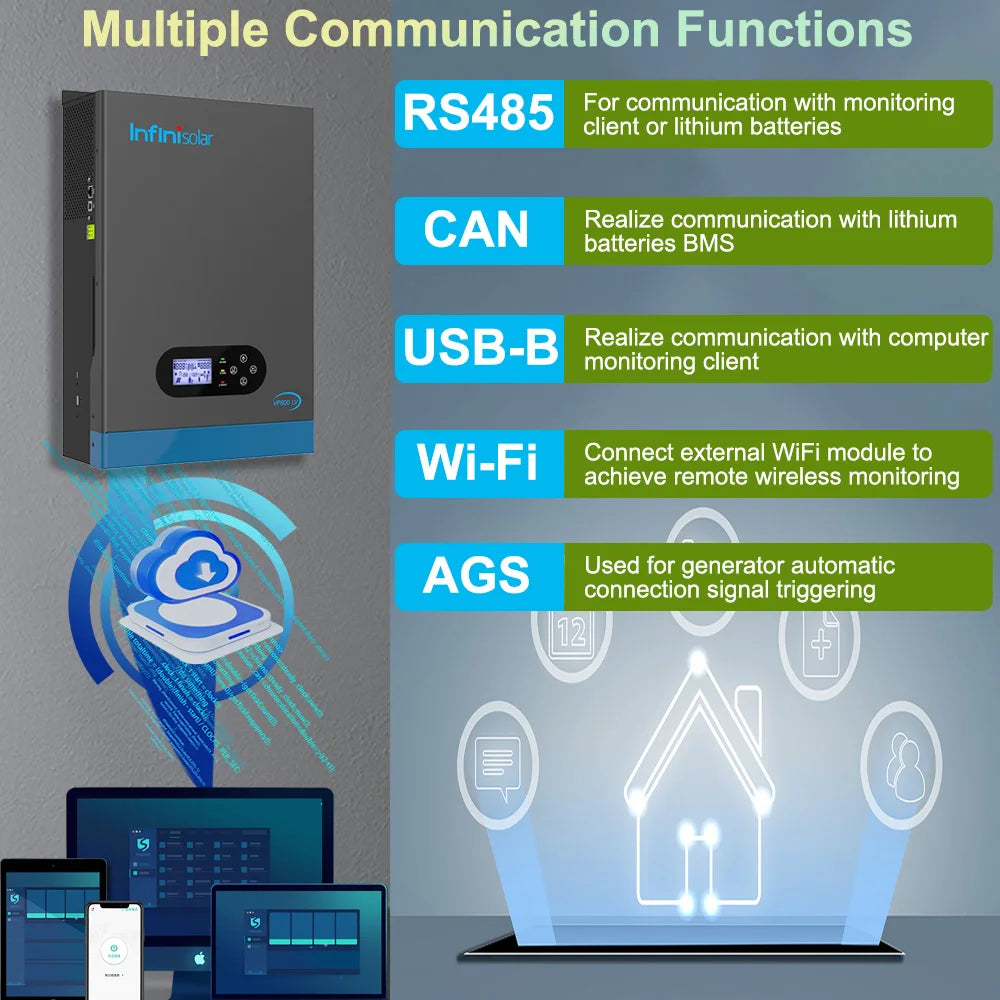 Through the built-in communication protocol and multiple independent communication interfaces (RS485, CAN, USB, WiFi, AGS), seamless communication between the inverter and external monitoring devices, generators and lithium batteries can be easily achieved.