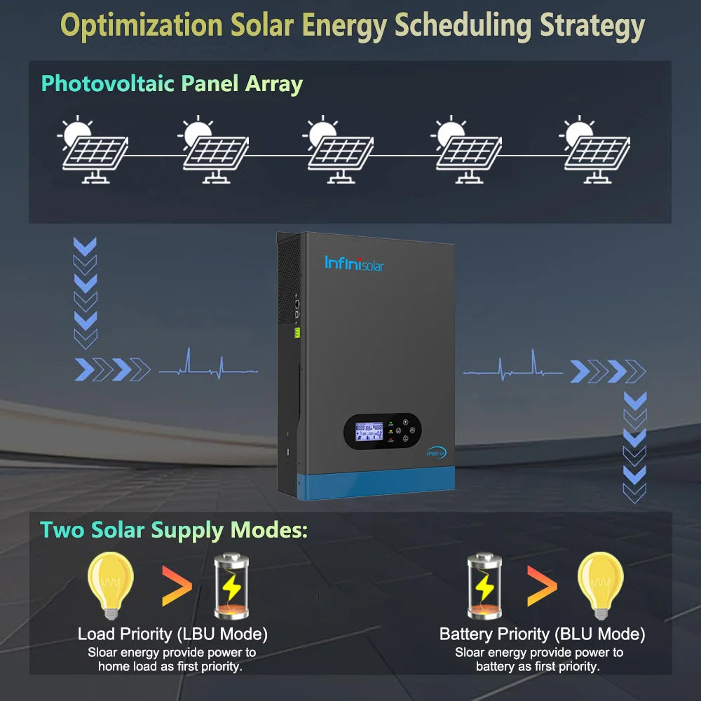 Featuring two solar supply modes: load priority and battery priority. Load priority mode can directly use solar energy to power home appliances for optimal self-consumption. Battery priority mode will charge the battery first for reliable backup energy. Let you align solar flow with your specific energy requirement.