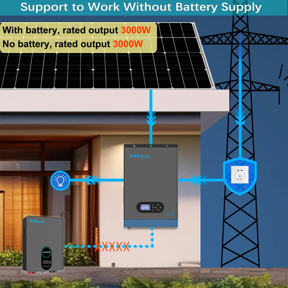 Battery-less operation enables direct solar-to-load power conversion, harnessing solar energy for immediate appliance operation. And in this scenario, the rated output power is up to 3000W, which is the same as the inverter's full rated power.