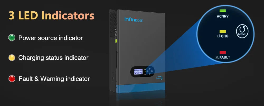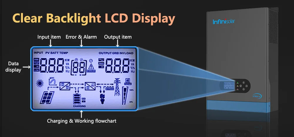 With function buttons and an LCD, indicating the operating status and input/output power information, allowing you to set parameters like battery charging current, working modes, etc.
