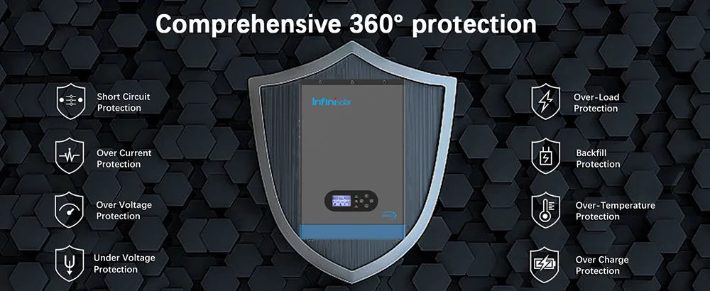 The hybrid solar inverter offers 360° comprehensive protection with various features, such as short circuit protection, over-voltage and under-voltage protection, overload protection, and reverse polarity protection. These safety measures significantly enhance the security of your electrical circuits and usage.