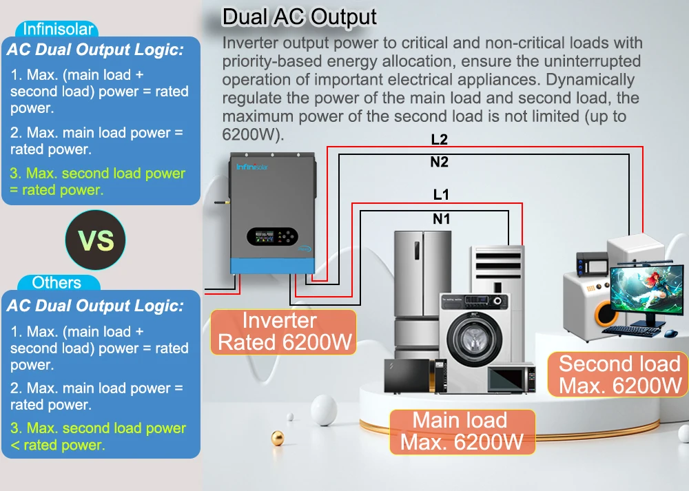 6.2KW rated power, dual AC 230V pure sine wave output, suitable for 98% of household and office appliances such as refrigerators, lamps, televisions, fans, air conditioning, and other AC loads.