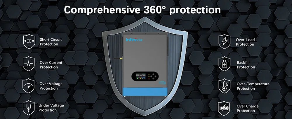 The hybrid solar inverter offers 360° comprehensive protection with various features, such as short circuit protection, over-voltage and under-voltage protection, overload protection, and reverse polarity protection. These safety measures significantly enhance the security of your electrical circuits and usage.