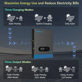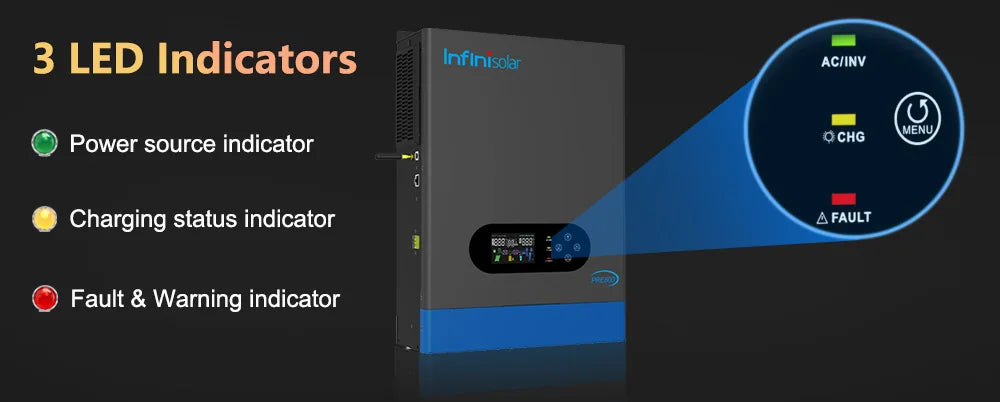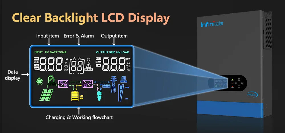 With function buttons and an LCD, indicating the operating status and input/output power information, allowing you to set parameters like battery charging current, working modes, etc.