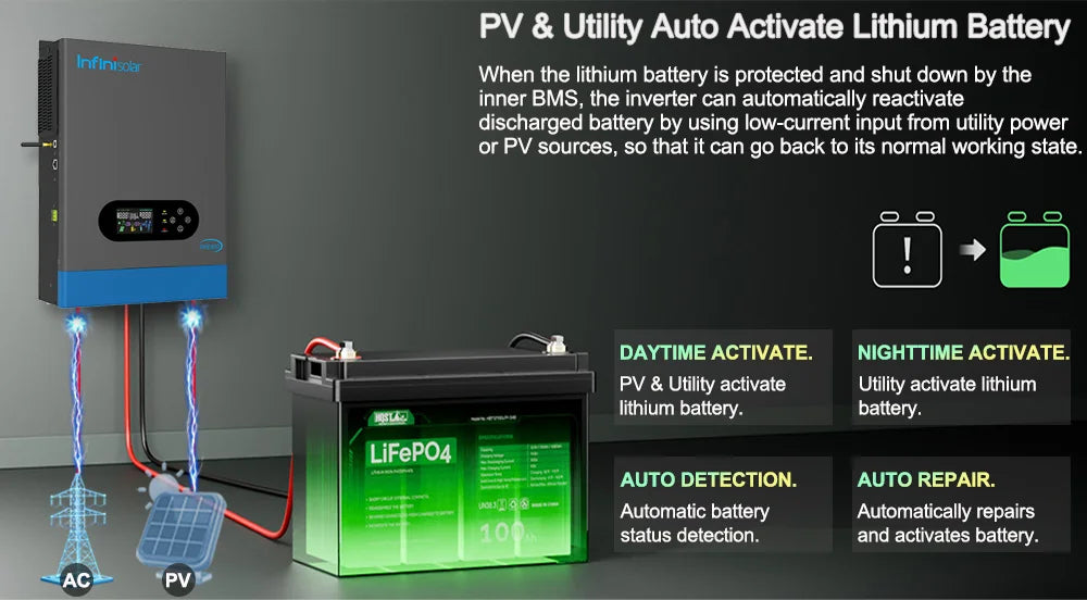 When the lithium battery is dormant, the mains AC power and photovoltaic can automatically detect its status and activate it back to working state. The dual activation function ensures the dormant lithium battery can be activated during both day and night.