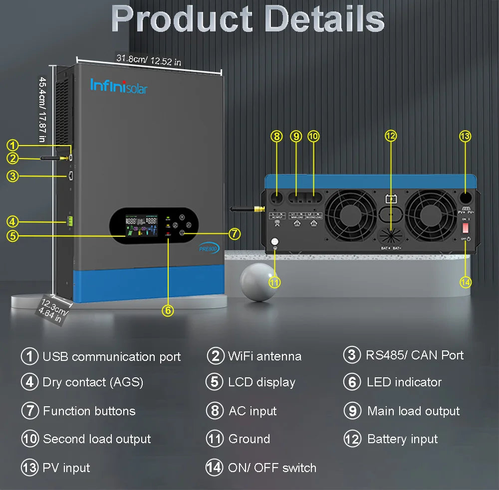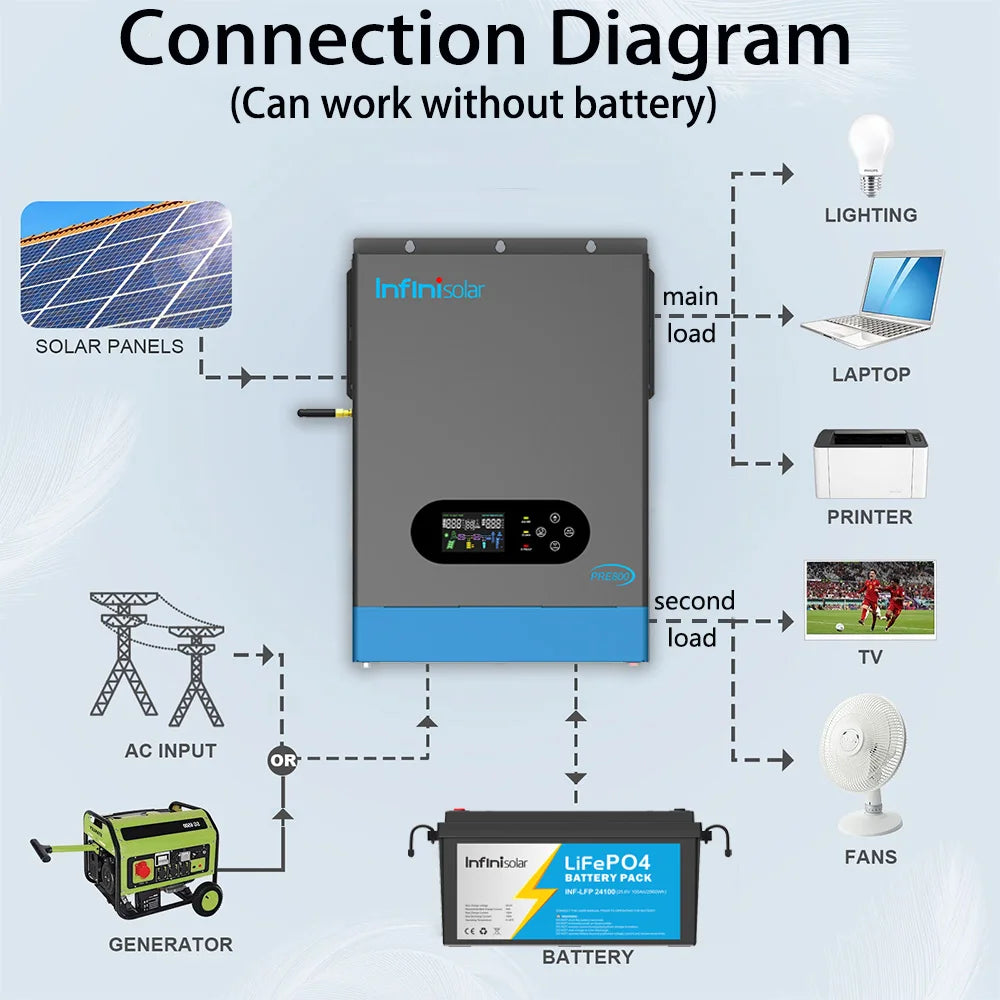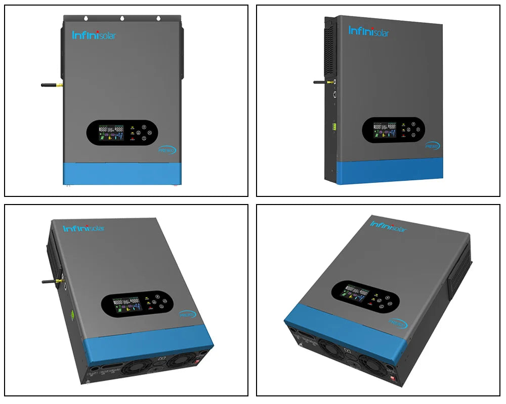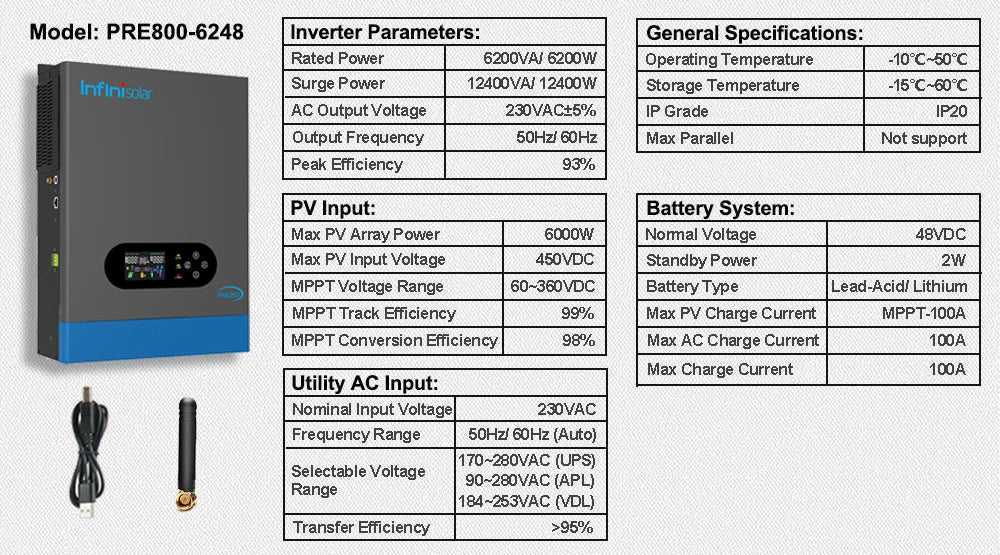Infinisolar PRE800-6248 inverter is a 6.2KW 48V to 220V/230V/240V single-phase off-grid all-in-one solar Inverter, with built-in 100A MPPT charger and 100A AC charger. Combining solar, AC utility/ generator, and battery to offer an uninterruptible power supply.