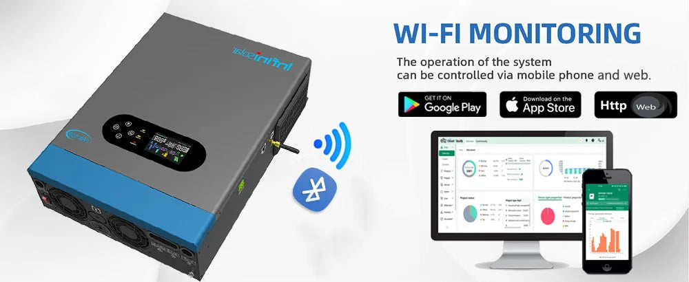 Relying on the built-in industrial-grade WiFi module and external high-gain WiFi antenna, users can effectively access real-time device status or adjust parameters anytime & anywhere through a mobile app or PC web. And no need to buy an extra WiFi module, really an ideal cost-saving choice for your solar power system.