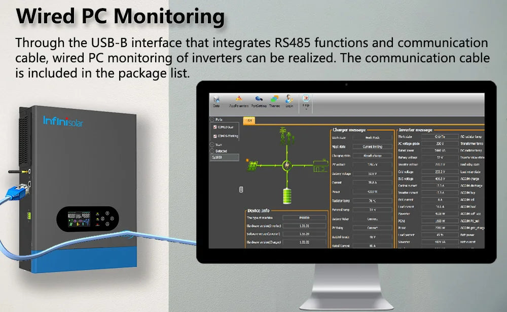 Through the USB-B interface that integrates RS-485 functions and a communication cable, wired PC monitoring of inverters can be realised. The communication cable is included in the package list. (Note: PC monitoring and Wi-Fi monitoring cannot be enabled at the same time.)