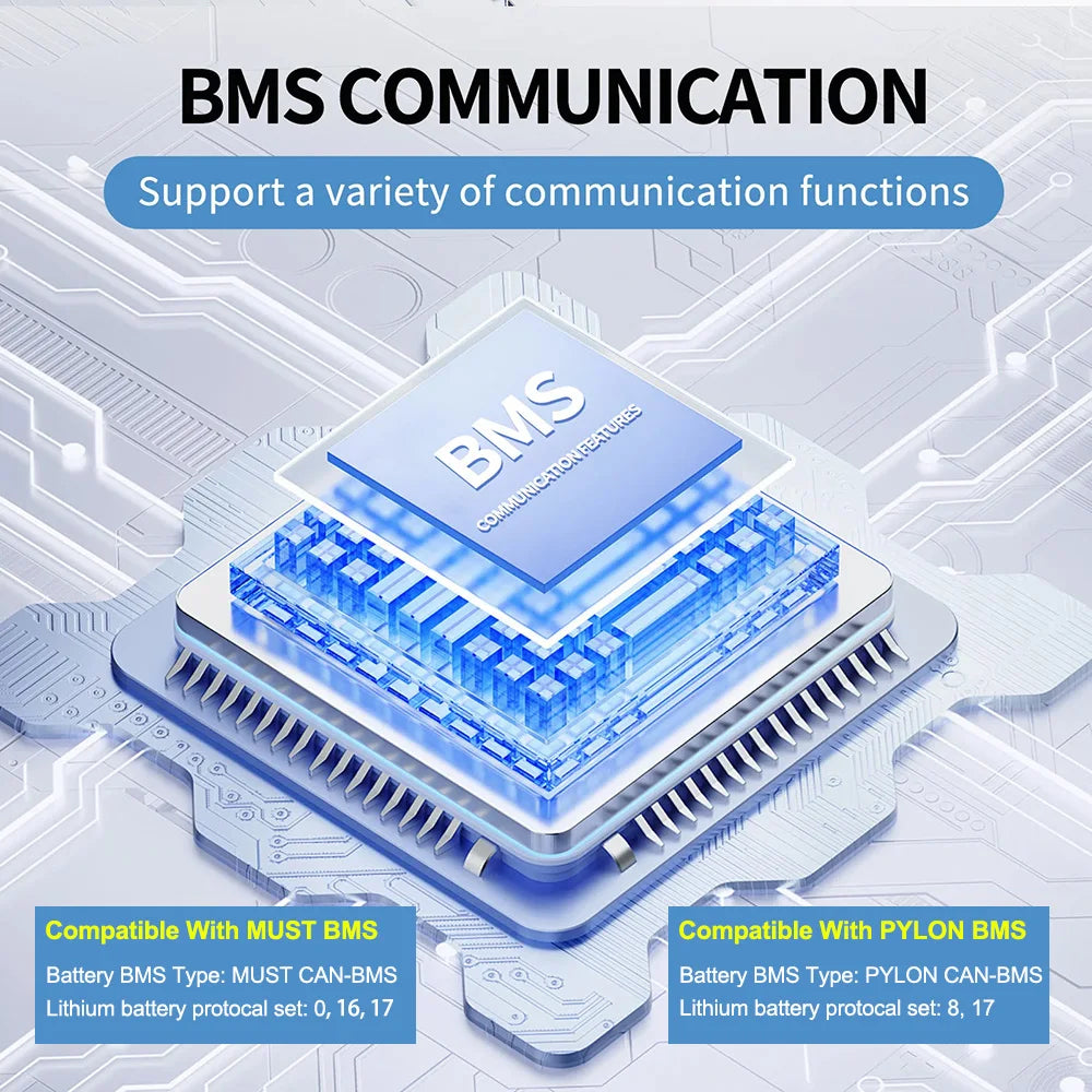The inverter is built with BMS protocols for seamless lithium battery communication. Compatible with MUST and PYLON lithium batteries via CAN protocols.