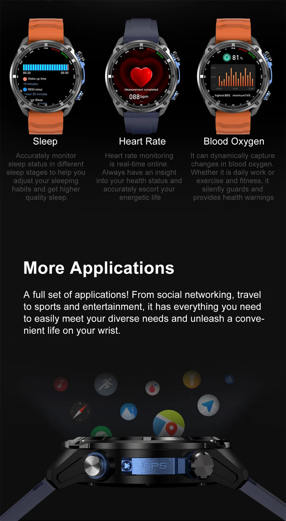 More features: Bluetooth calling, offline map, flashlight, multiple 3D menu styles, support more than 200 dials, breathing training, custom dial (video dial), stopwatch, brightness adjustment, real sleep, real heart rate, information push, remote music, remote photography, real weather, find mobile phone, Bluetooth music playback, password protection, calculator, split-screen display, quick widgets, weather, voice assistant, alarm clock, power saving mode, smart and watch mode selection, explosion-proof glass, gaming, multiple screen-off clocks, independent ringtones, local music, video playback, USB data transmission, TWS, photo album, always-on screen, built-in GPS.