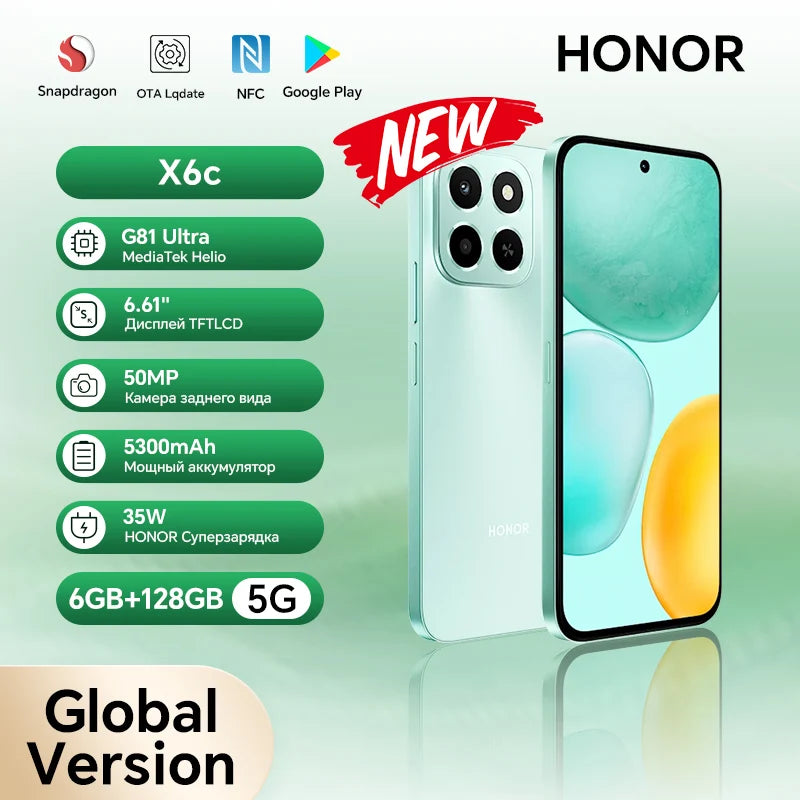 Honor X6c Global Version Smartphone 6.61'' 120Hz TFTLCD Screen 50MP 5300mAh 35W Super Charge Waterproof Drop Resistance