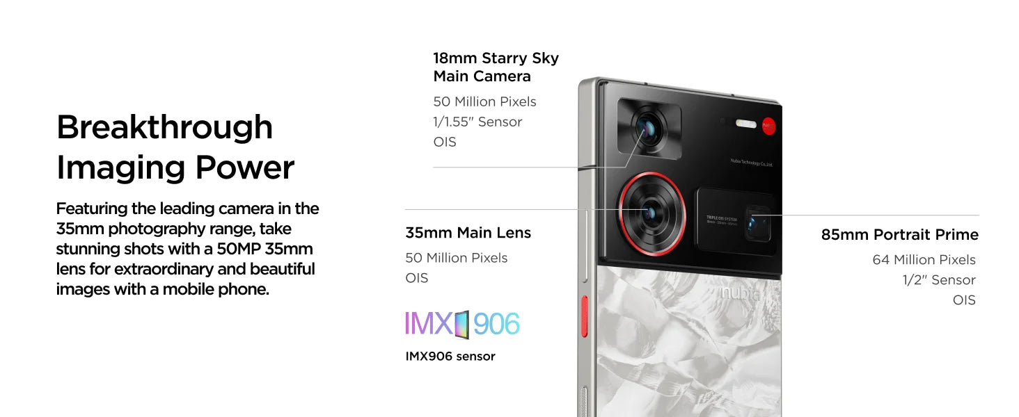 >Camera --- Rear camera:50MP (35mm IMX906 OIS, 1/1.56 inch 1.0µm, Quad Bayer, 1G+6P F/1.59, QPD)+50MP Wide-Angle (OV50E, AF, Large Sensor OIS, 1/1.55 inch 1.0µm pixel size, 100°, Quad Bayer, 7P F/1.8, 5.5cm macro)+64MP (OV64B 85mm OIS, 5P F/3.3) Multispectral Sensor + Laser Autofocus