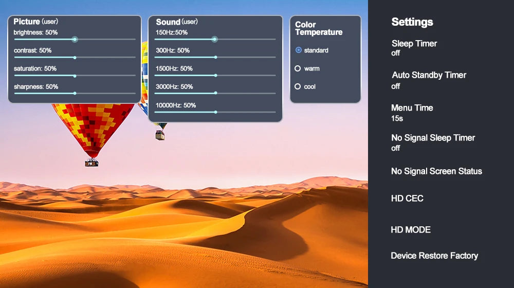 HD Signal supports adjusting image brightness, contrast, saturation, and sharpness