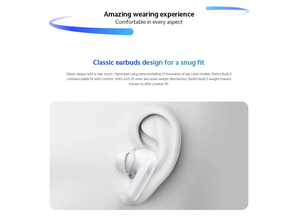 Classic design with a new touch. Optimised using data modelling of thousands of ear canal models, Redmi Buds 5