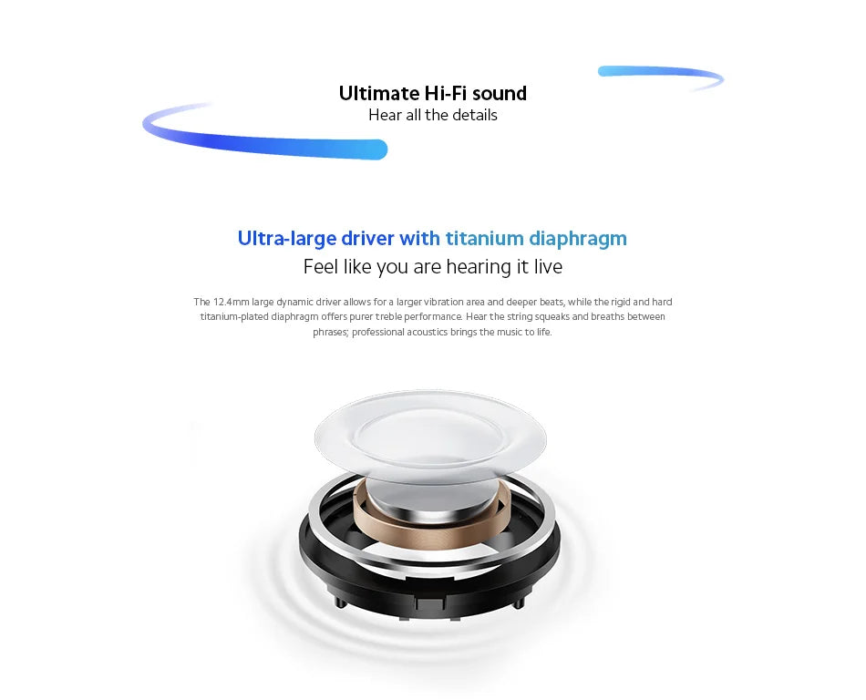 The 12.4mm large dynamic driver allows for a larger vibration area and deeper beats, while the rigid and hard