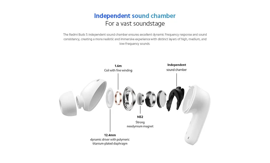 The Redmi Buds 5's independent sound chamber ensures excellent dynamic frequency response and sound