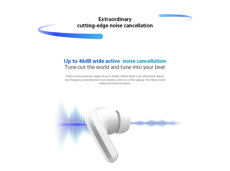 With a noise reduction depth of up to 46dB*, Redmi Buds 5 can effectively reduce